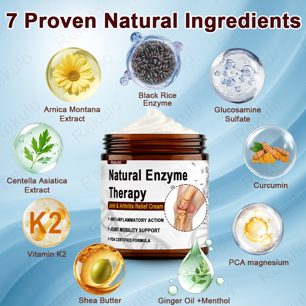 We've developed a unique cream that targets the root cause of joint and muscle discomfort.Powered by Black Rice Enzyme and Anthocyanins, it works deep beneath the skin to calm inflammation, boost microcirculation, and support natural tissue recovery. With every application, you’re delivering antioxidant and restorative nutrients directly to the areas that ache — helping your body heal, move, and feel better naturally.